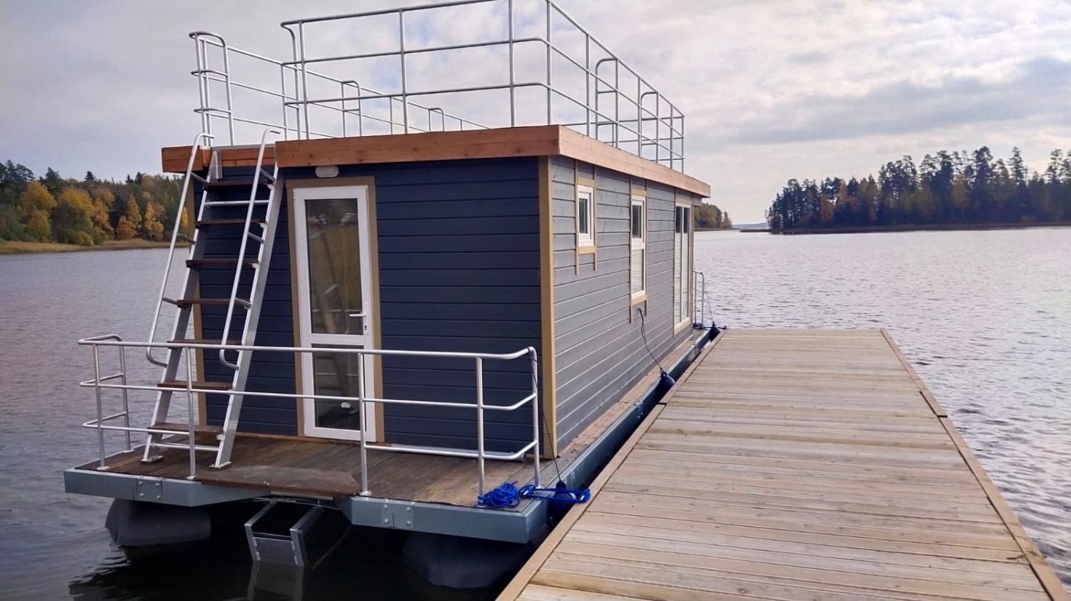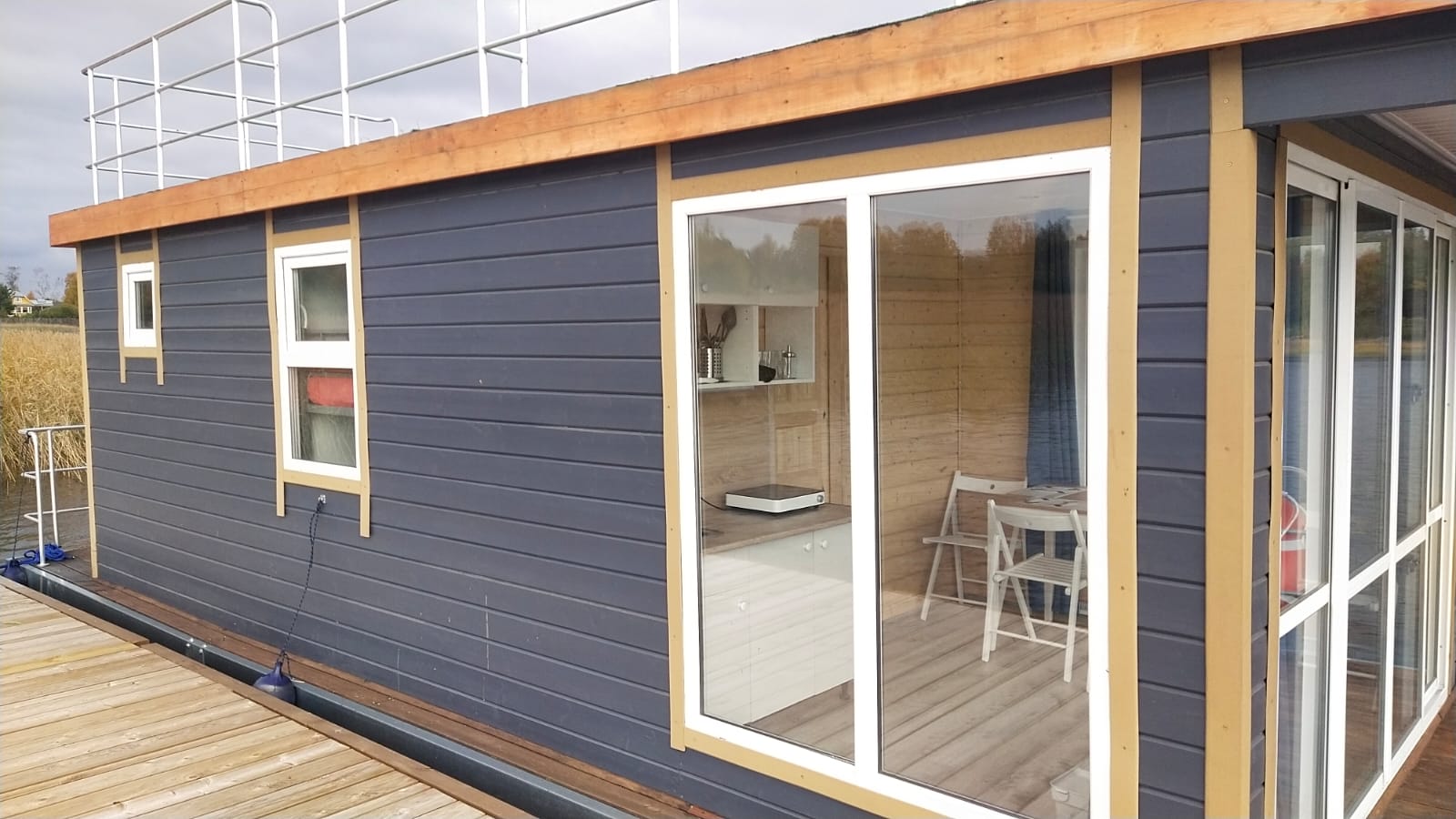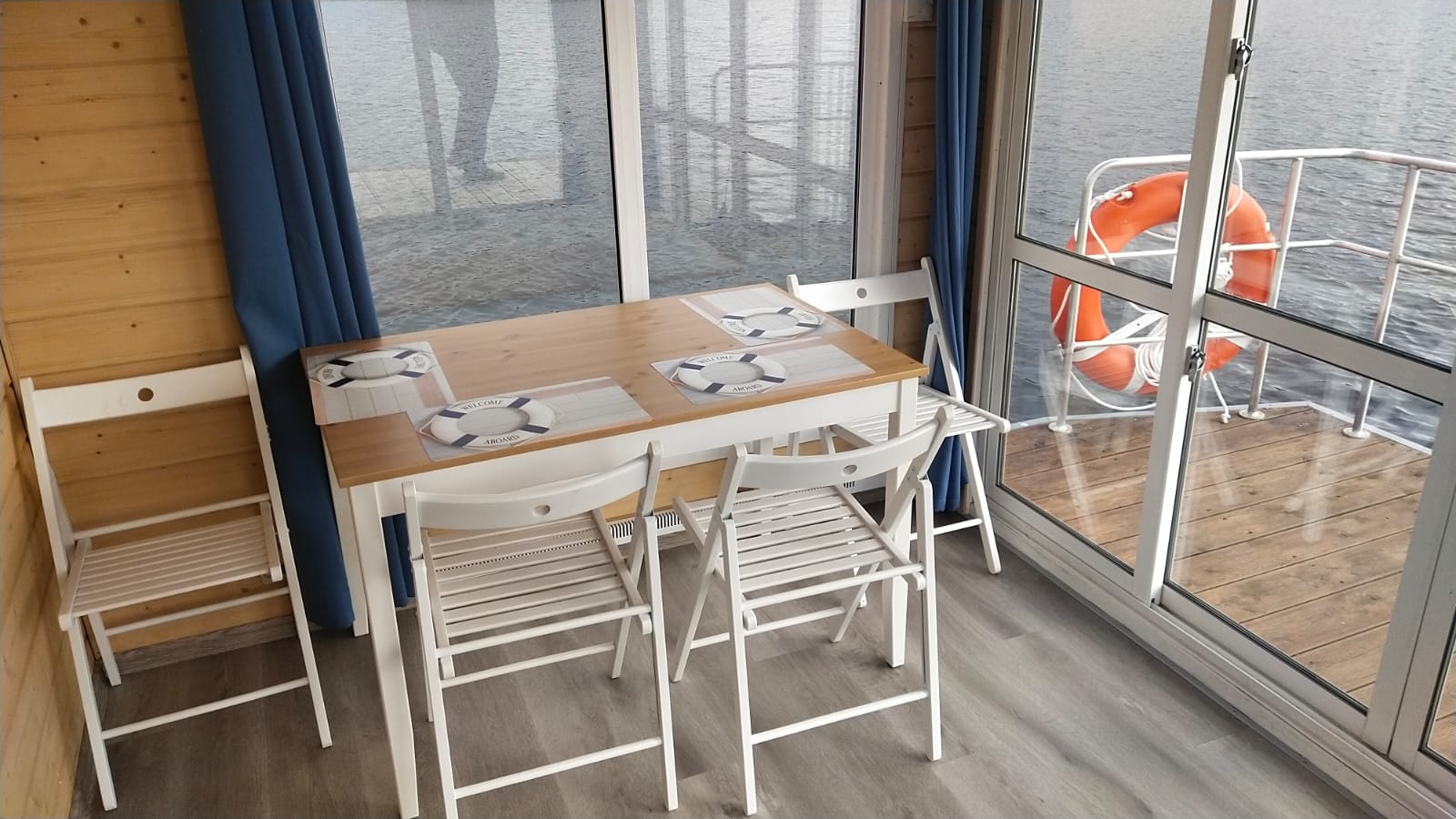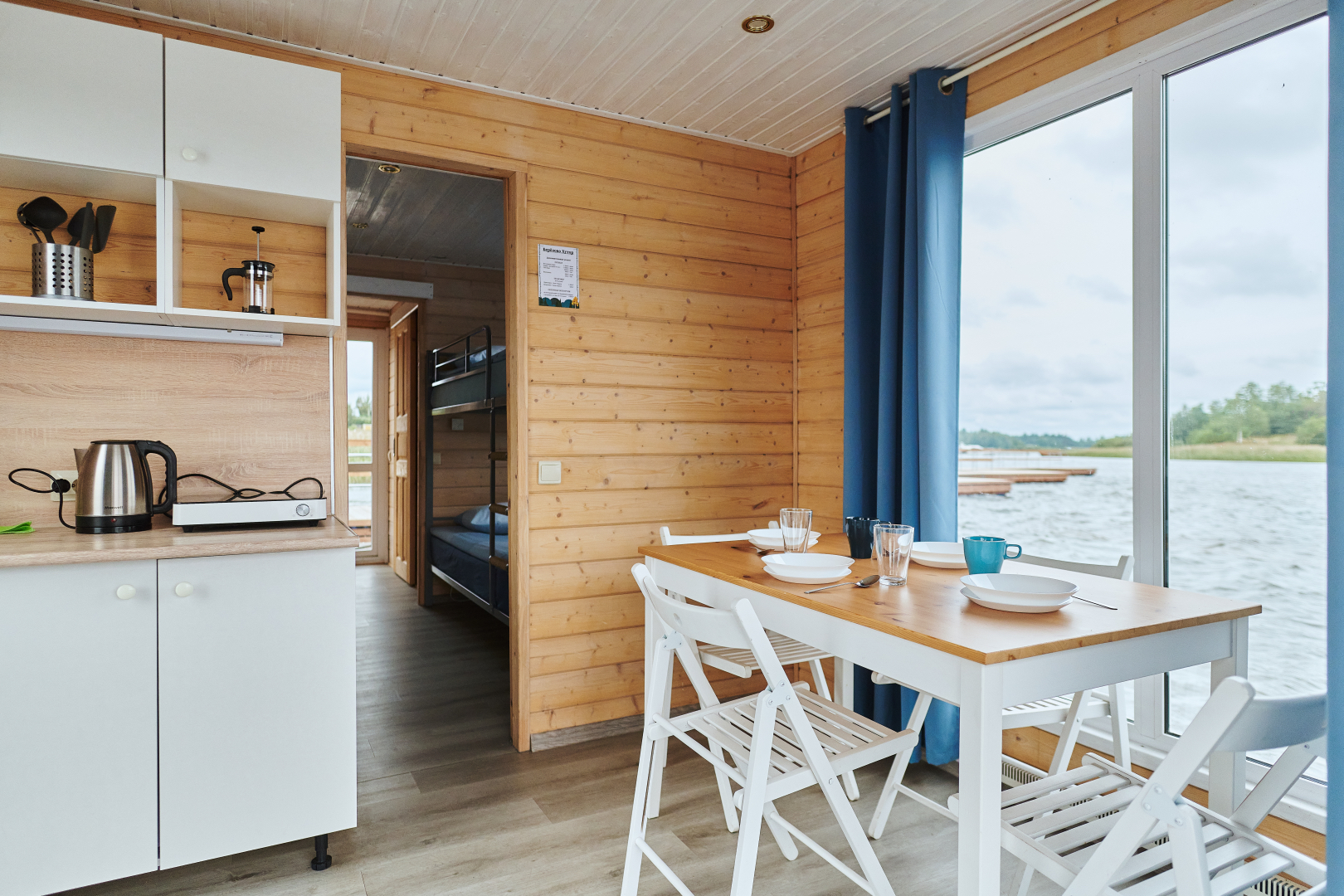 Дом на воде со всеми удобствами и отоплением – спальная зона (2 двухъярусные кровати), кухня-гостиная (стол, стулья, холодильник, плита, чайник, все кухонные принадлежности), туалет, душ, постельное белье, полотенца.